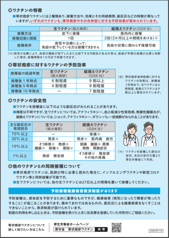 帯状疱疹は、加齢や免疫力低下により発症しやすく、強い痛みや後遺症を残すことがあります。予防接種により、発症や重症化を防ぐ効果が期待されています。