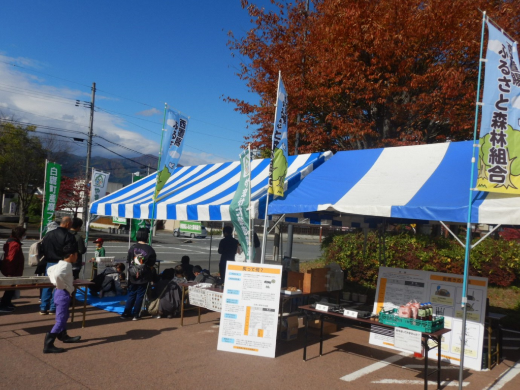 令和7年11月1日 白鷹町役場を会場に開催された白鷹町産業フェア2025にて、木炭文化に触れていただけるよう体験ブースを2つ設置しました。