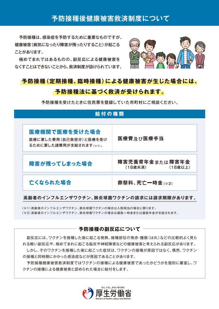 詳しくは、厚生労働省「予防接種健康被害救済制度について」(外部リンク)をご参照ください。