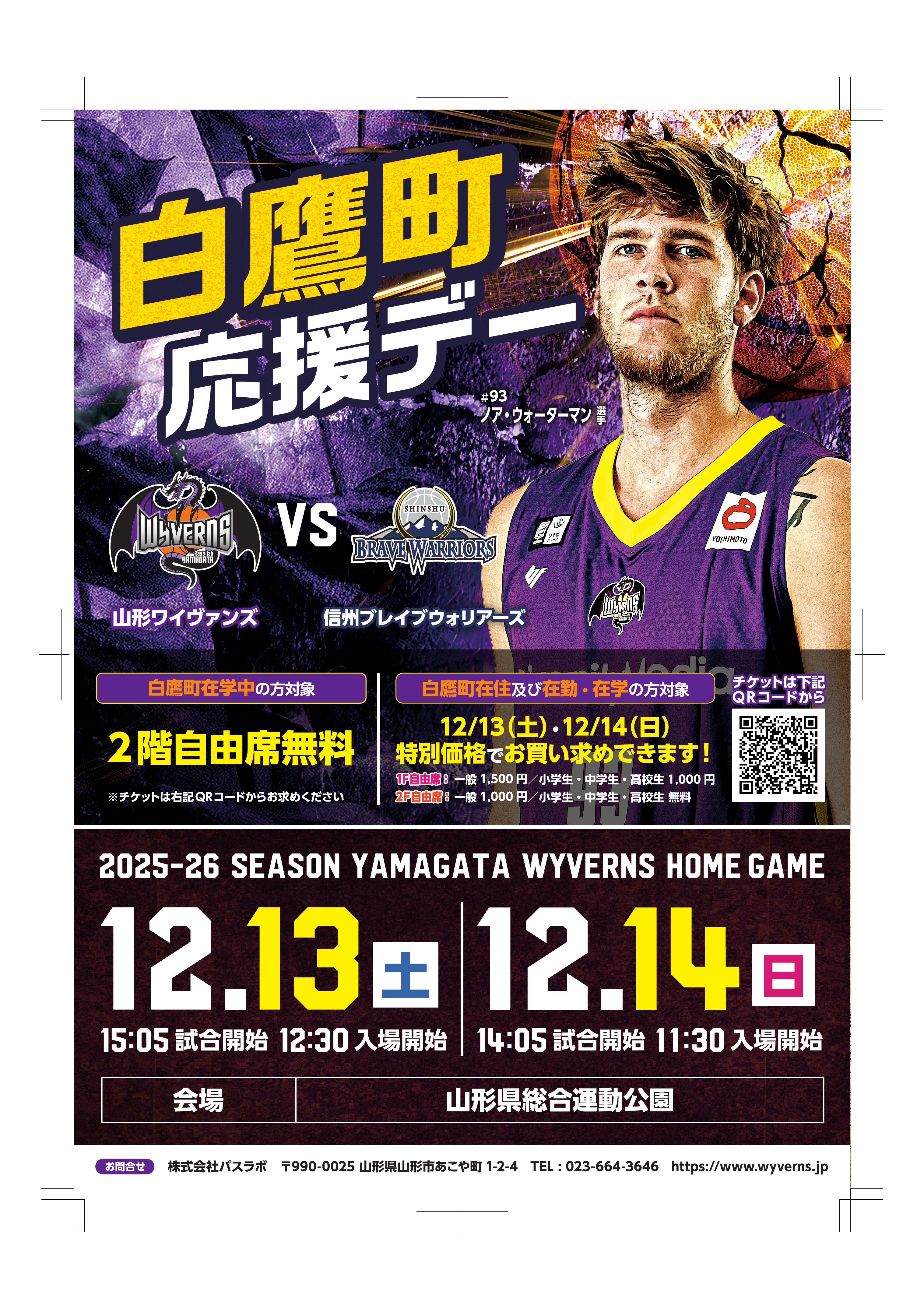 パスラボ山形ワイヴァンズ 白鷹町民応援デー12/13(土)・14(日)開催決定!