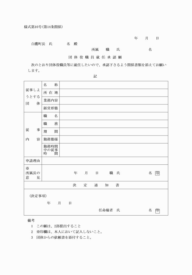 第14条 職員は、前条に規定する場合を除き、職員として団体(職員団体及び労働組合を除く。)の役職員等の地位につこうとする場合、団体役職員就任承認願(様式第10号)に当該団体からの依頼書を添えて提出し、任命権者の承認を受けなければならない。ただし、役職員就任について、任命権者があらかじめ支障がないと認め、当該職員に通知した場合にあっては、この限りでない。