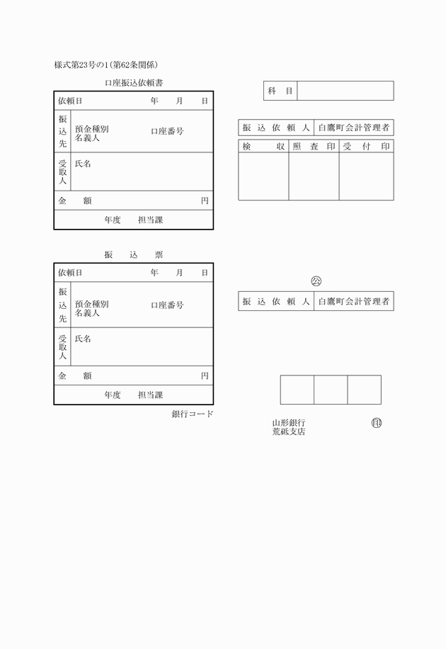 白鷹町町税等口座振替依頼書・自動払込利用申込書(金融機関用) | ||