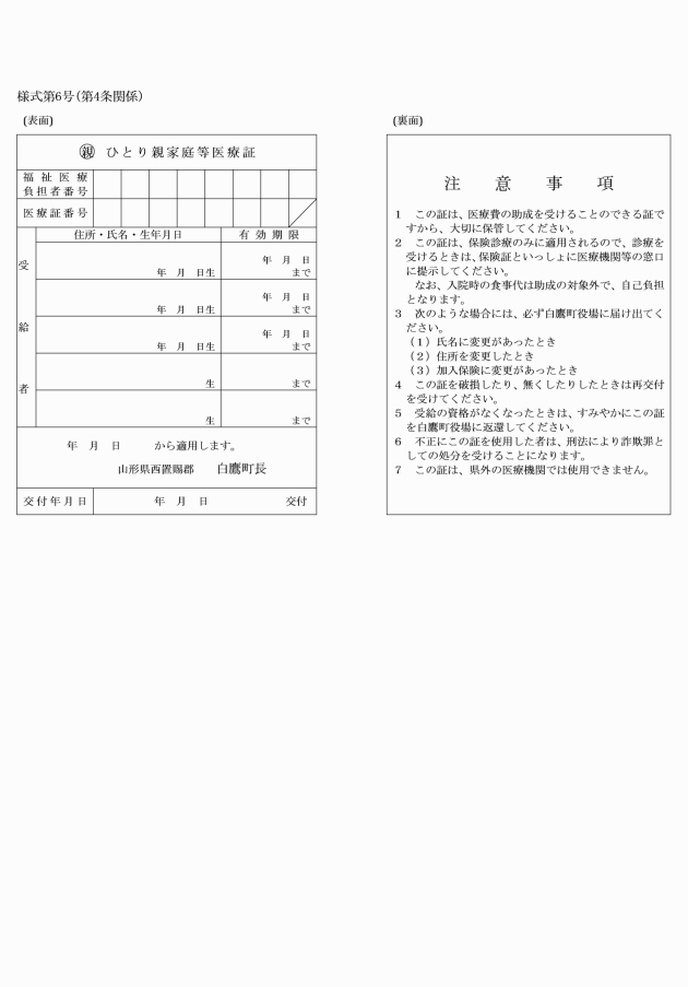 2 この規則施行の際、現にこの規則による改正前の白鷹町医療給付事業に関する条例施行規則の規定に基づき交付された医療証については、当分の間、これを使用することができる。この場合において様式第4号から様式第5号による医療証中「