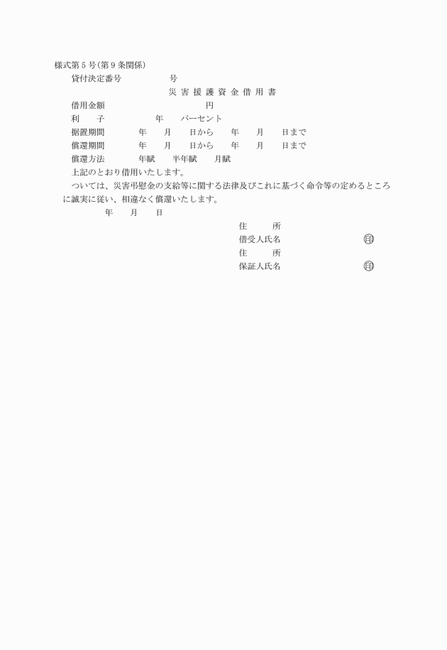 第9条 貸付決定通知書の交付を受けた者は、すみやかに借用書(保証人を立てる場合は、保証人の連署した借用書)に、資金の貸付けを受けた者(以下「借受人」という。)の印鑑証明書(保証人を立てる場合は、借受人及び保証人の印鑑証明書)を添えて町長に提出しなければならない。