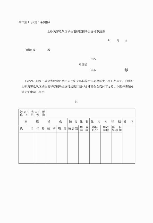 第3条 補助金の交付を受けようとする者は、土砂災害危険区域住宅移転補助金交付申請書(様式第1号)を町長に提出しなければならない。この場合において、補助金交付申請書に添付すべき書類は、次のとおりとする。